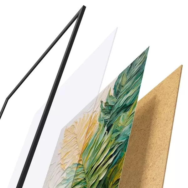 Plakát se skládá z rámu, plexiskla, tištěného obrazu a dřevotřískového podkladu. Díky úchytům na zadní straně lze plakát ihned zavěsit na zeď.