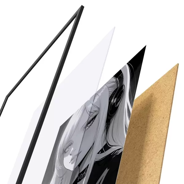 Plakát se skládá z rámu, plexiskla, tištěného obrazu a dřevotřískového podkladu. Díky úchytům na zadní straně lze plakát ihned zavěsit na zeď.