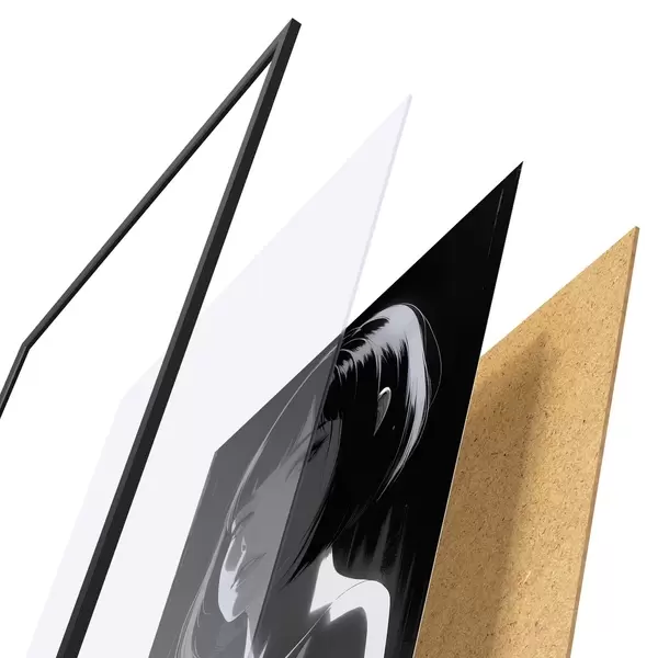 Plakát se skládá z rámu, plexiskla, tištěného obrazu a dřevotřískového podkladu. Díky úchytům na zadní straně lze plakát ihned zavěsit na zeď.