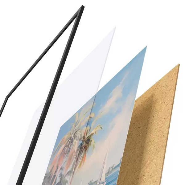 Plakát se skládá z rámu, plexiskla, tištěného obrazu a dřevotřískového podkladu. Díky úchytům na zadní straně lze plakát ihned zavěsit na zeď.