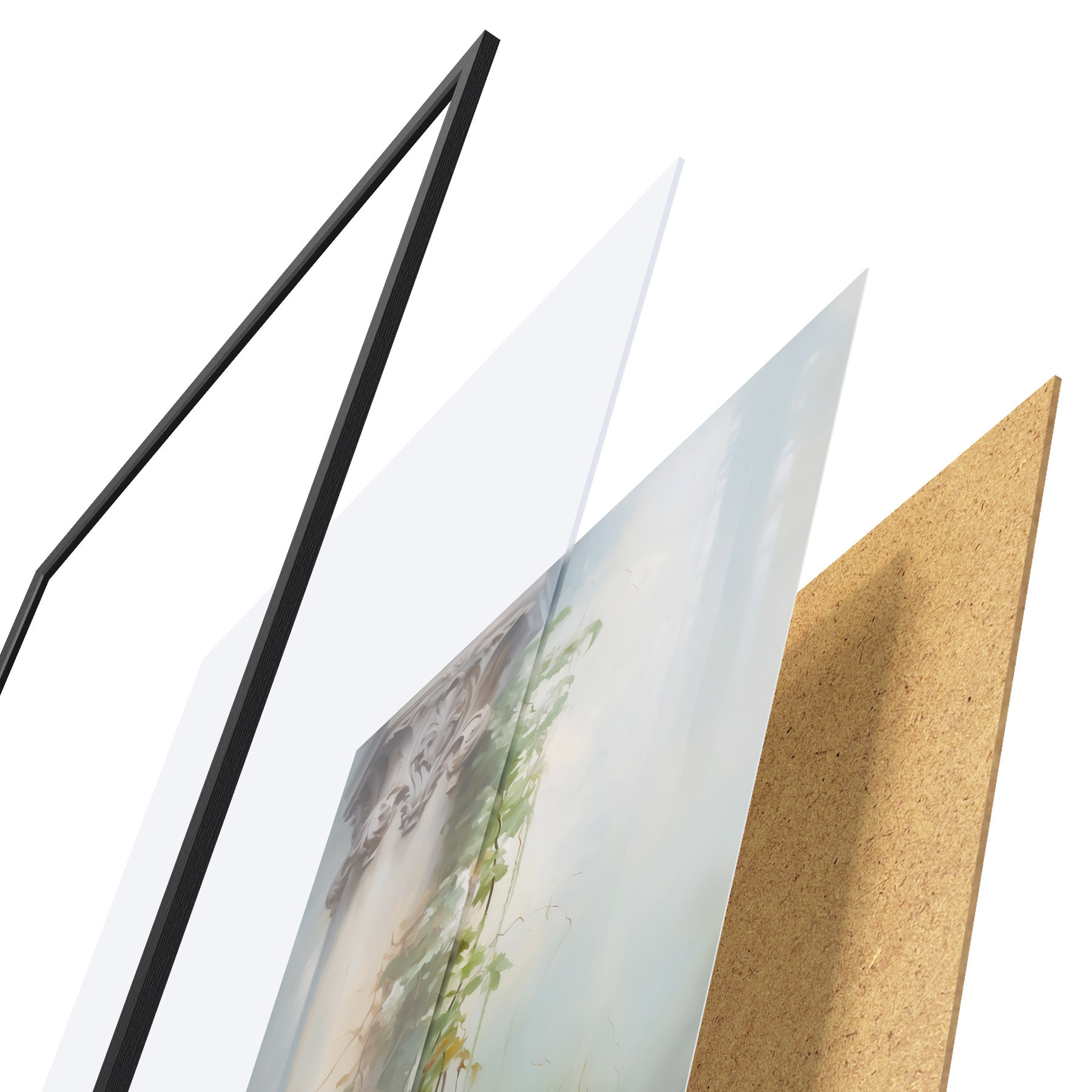 Plakát se skládá z rámu, plexiskla, tištěného obrazu a dřevotřískového podkladu. Díky úchytům na zadní straně lze plakát ihned zavěsit na zeď.