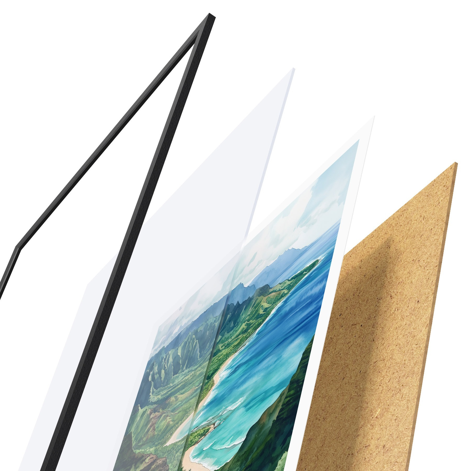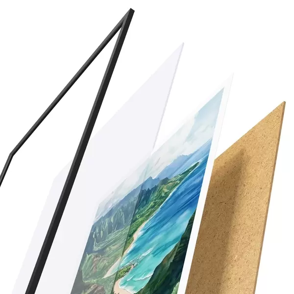 Plakát se skládá z rámu, plexiskla, tištěného obrazu a dřevotřískového podkladu. Díky úchytům na zadní straně lze plakát ihned zavěsit na zeď.
