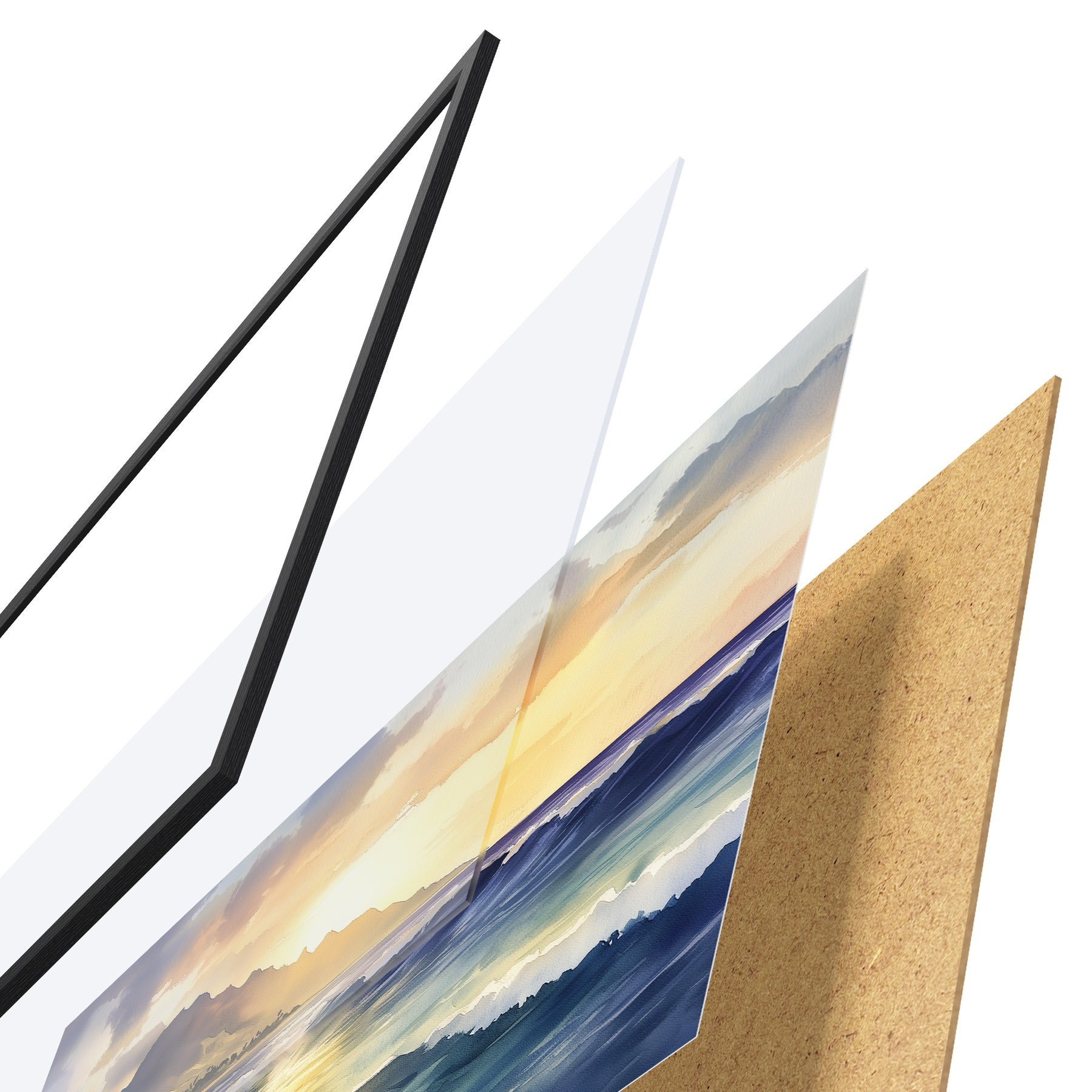 Plakát se skládá z rámu, plexiskla, tištěného obrazu a dřevotřískového podkladu. Díky úchytům na zadní straně lze plakát ihned zavěsit na zeď.