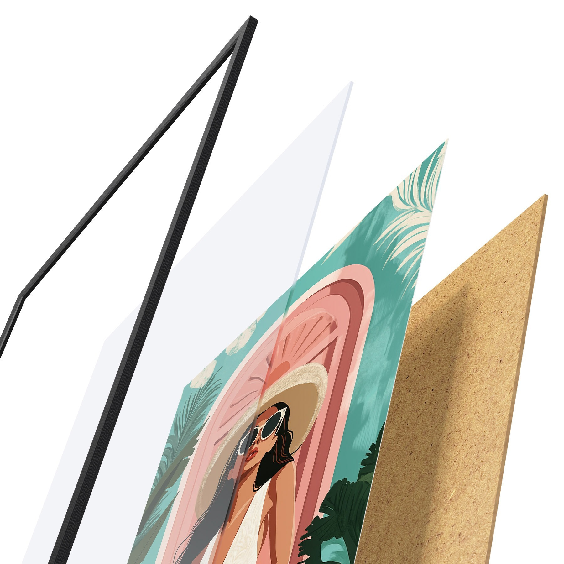 Plakát se skládá z rámu, plexiskla, tištěného obrazu a dřevotřískového podkladu. Díky úchytům na zadní straně lze plakát ihned zavěsit na zeď.