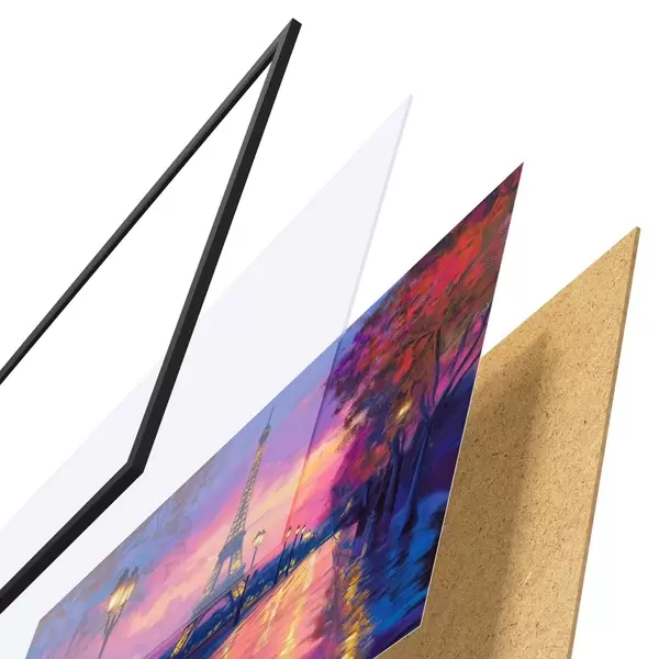 Plakát se skládá z rámu, plexiskla, tištěného obrazu a dřevotřískového podkladu. Díky úchytům na zadní straně lze plakát ihned zavěsit na zeď.