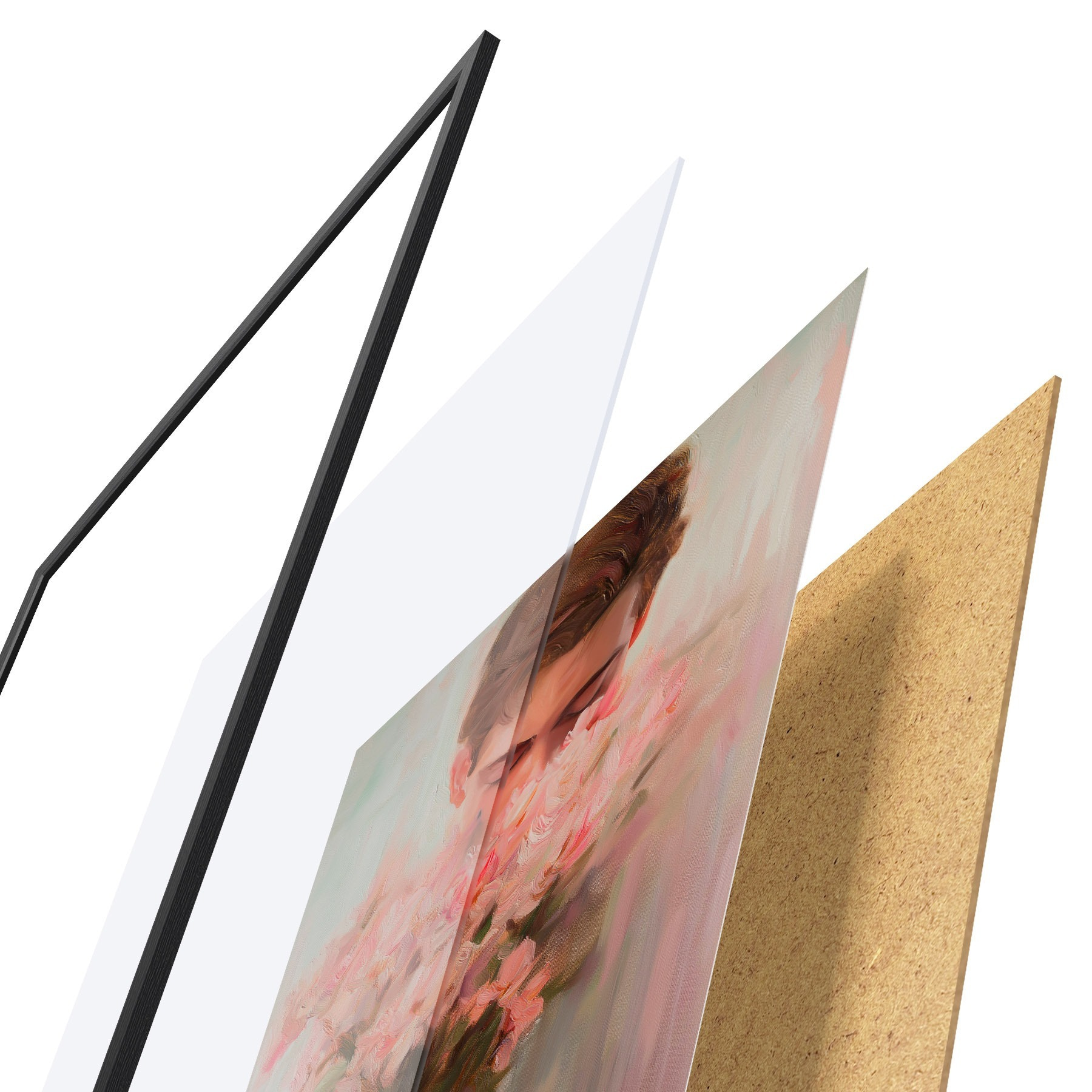 Plakát se skládá z rámu, plexiskla, tištěného obrazu a dřevotřískového podkladu. Díky úchytům na zadní straně lze plakát ihned zavěsit na zeď.