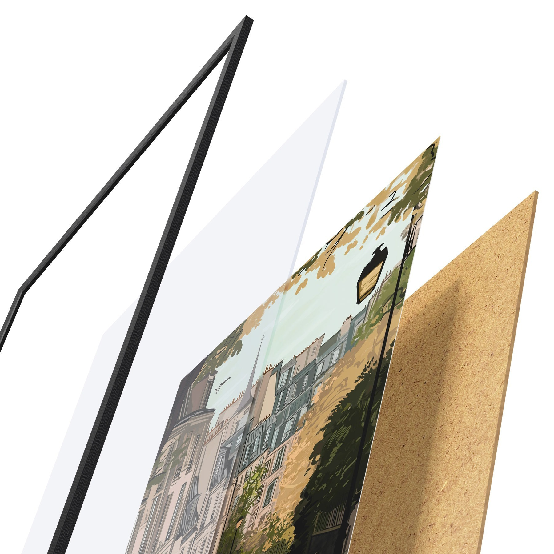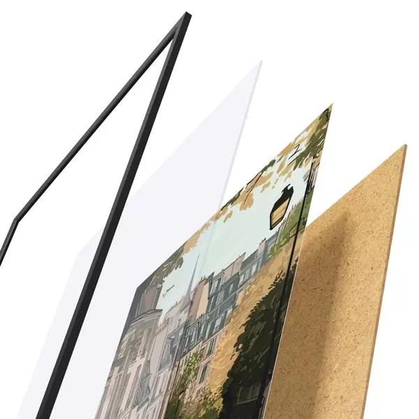 Plakát se skládá z rámu, plexiskla, tištěného obrazu a dřevotřískového podkladu. Díky úchytům na zadní straně lze plakát ihned zavěsit na zeď.