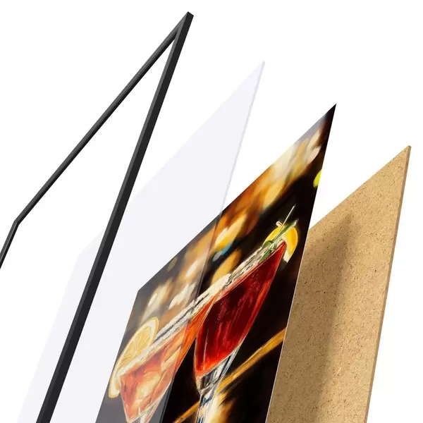 Plakát se skládá z rámu, plexiskla, tištěného obrazu a dřevotřískového podkladu. Díky úchytům na zadní straně lze plakát ihned zavěsit na zeď.