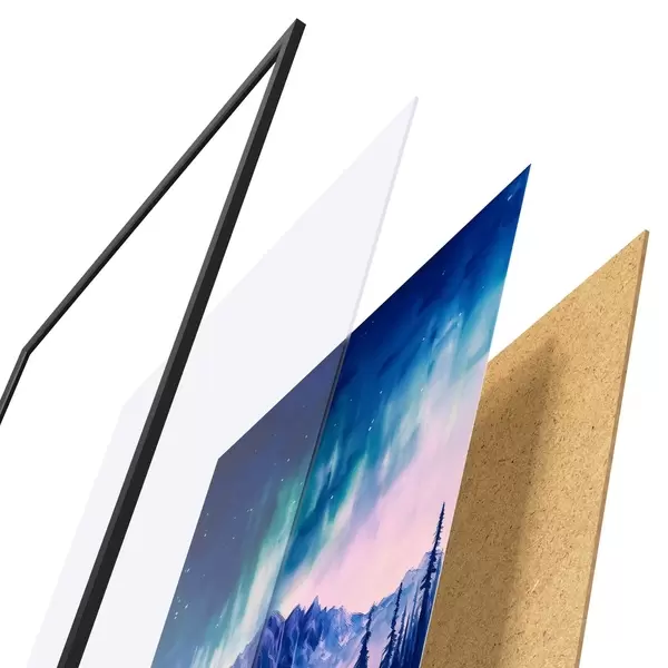 Plakát se skládá z rámu, plexiskla, tištěného obrazu a dřevotřískového podkladu. Díky úchytům na zadní straně lze plakát ihned zavěsit na zeď.