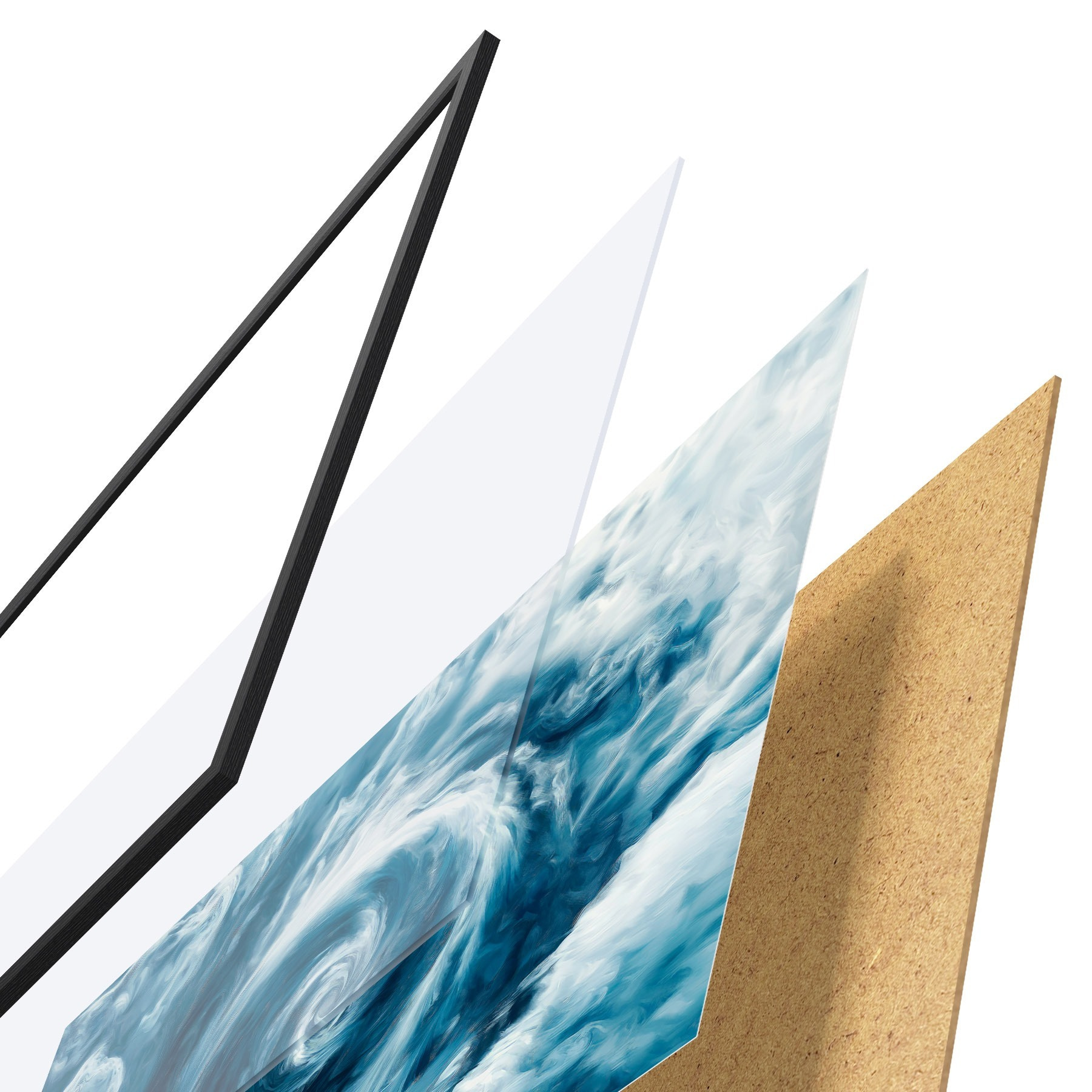 Plakát se skládá z rámu, plexiskla, tištěného obrazu a dřevotřískového podkladu. Díky úchytům na zadní straně lze plakát ihned zavěsit na zeď.