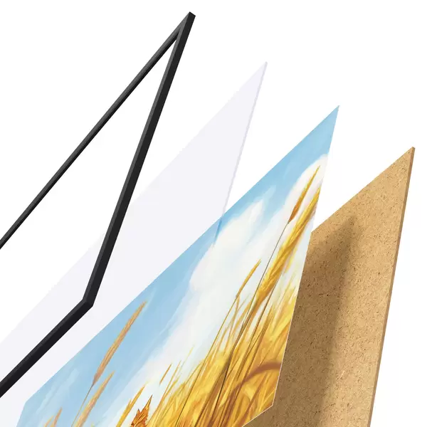 Plakát se skládá z rámu, plexiskla, tištěného obrazu a dřevotřískového podkladu. Díky úchytům na zadní straně lze plakát ihned zavěsit na zeď.