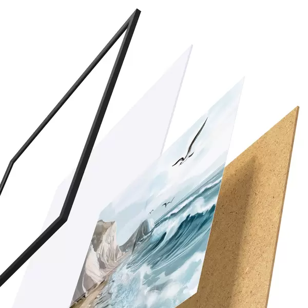 Plakát se skládá z rámu, plexiskla, tištěného obrazu a dřevotřískového podkladu. Díky úchytům na zadní straně lze plakát ihned zavěsit na zeď.