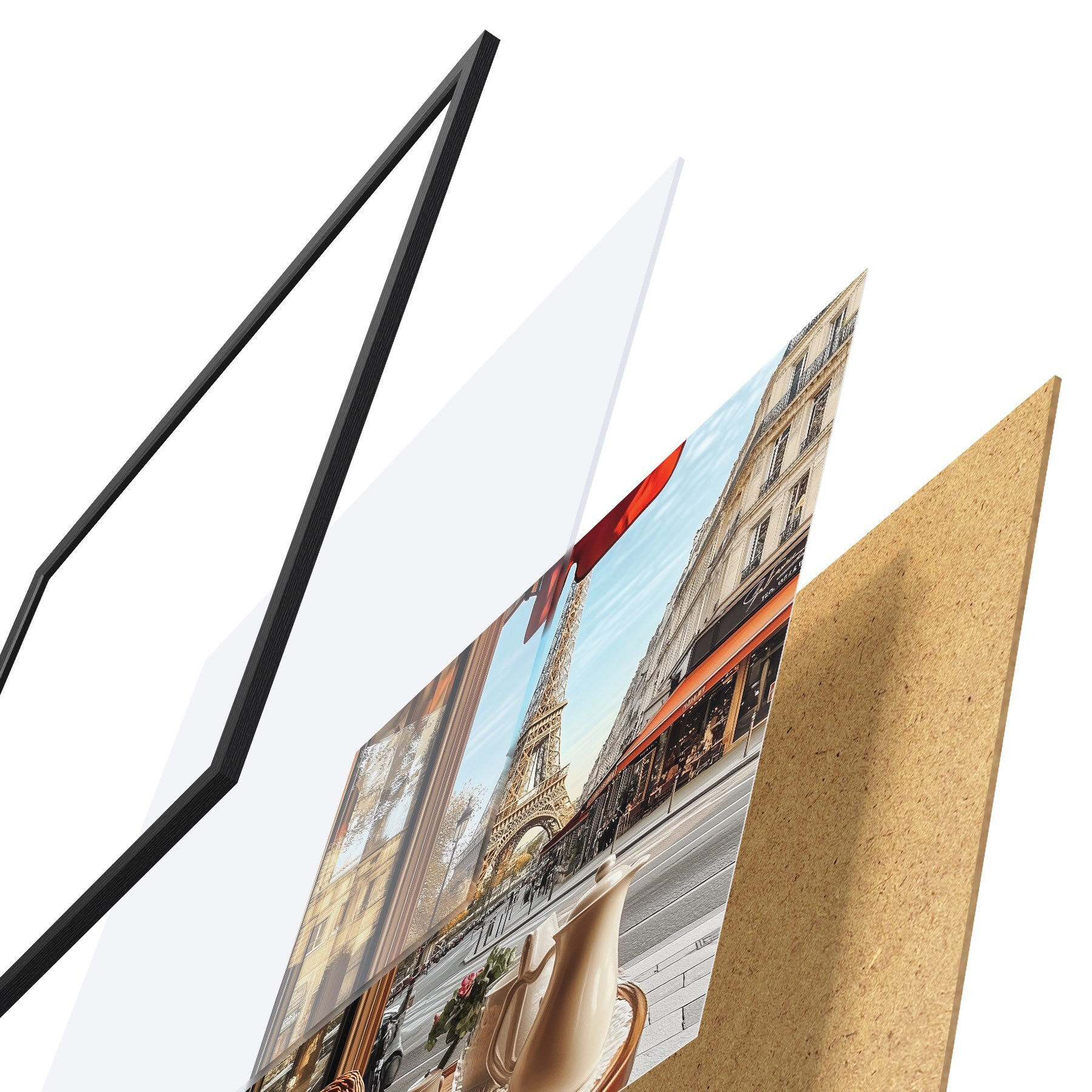 Plakát se skládá z rámu, plexiskla, tištěného obrazu a dřevotřískového podkladu. Díky úchytům na zadní straně lze plakát ihned zavěsit na zeď.