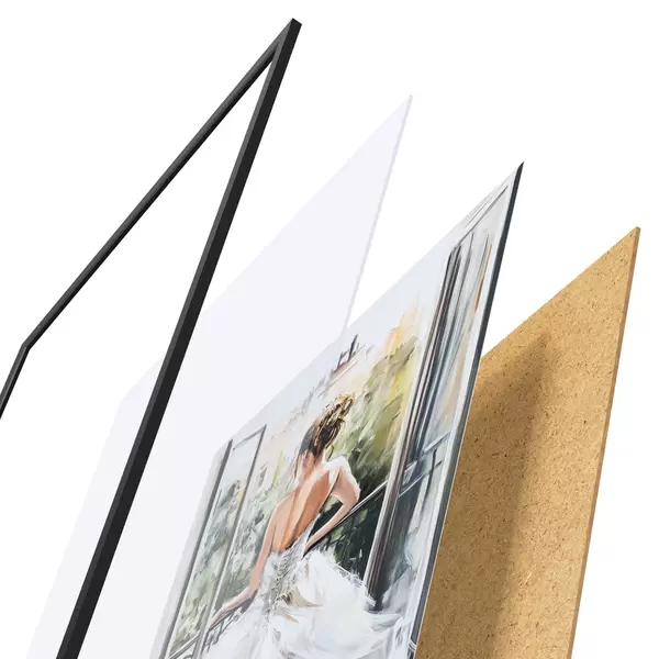 Plakát se skládá z rámu, plexiskla, tištěného obrazu a dřevotřískového podkladu. Díky úchytům na zadní straně lze plakát ihned zavěsit na zeď.