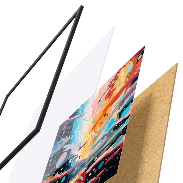 Plakát se skládá z rámu, plexiskla, tištěného obrazu a dřevotřískového podkladu. Díky úchytům na zadní straně lze plakát ihned zavěsit na zeď.