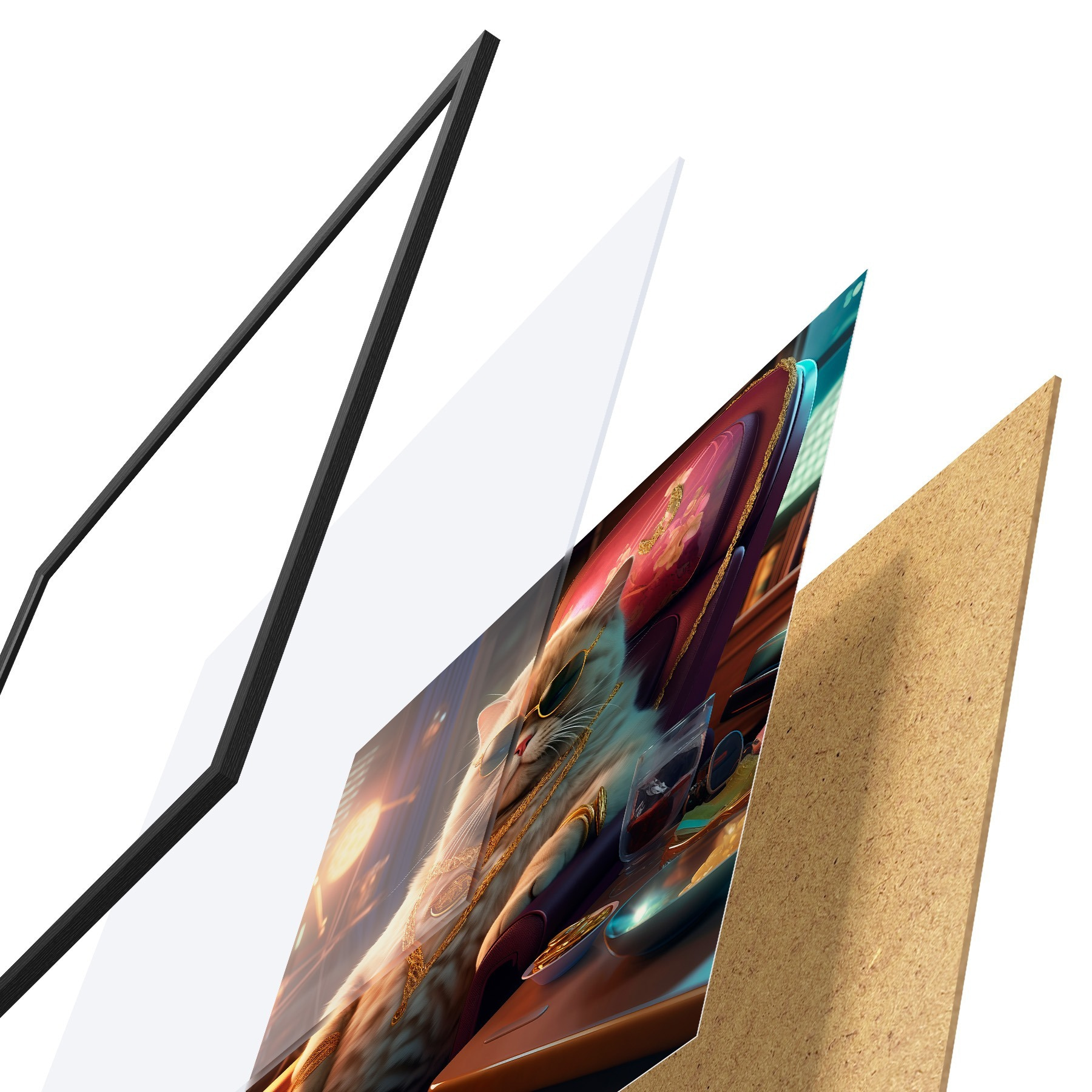 Plakát se skládá z rámu, plexiskla, tištěného obrazu a dřevotřískového podkladu. Díky úchytům na zadní straně lze plakát ihned zavěsit na zeď.