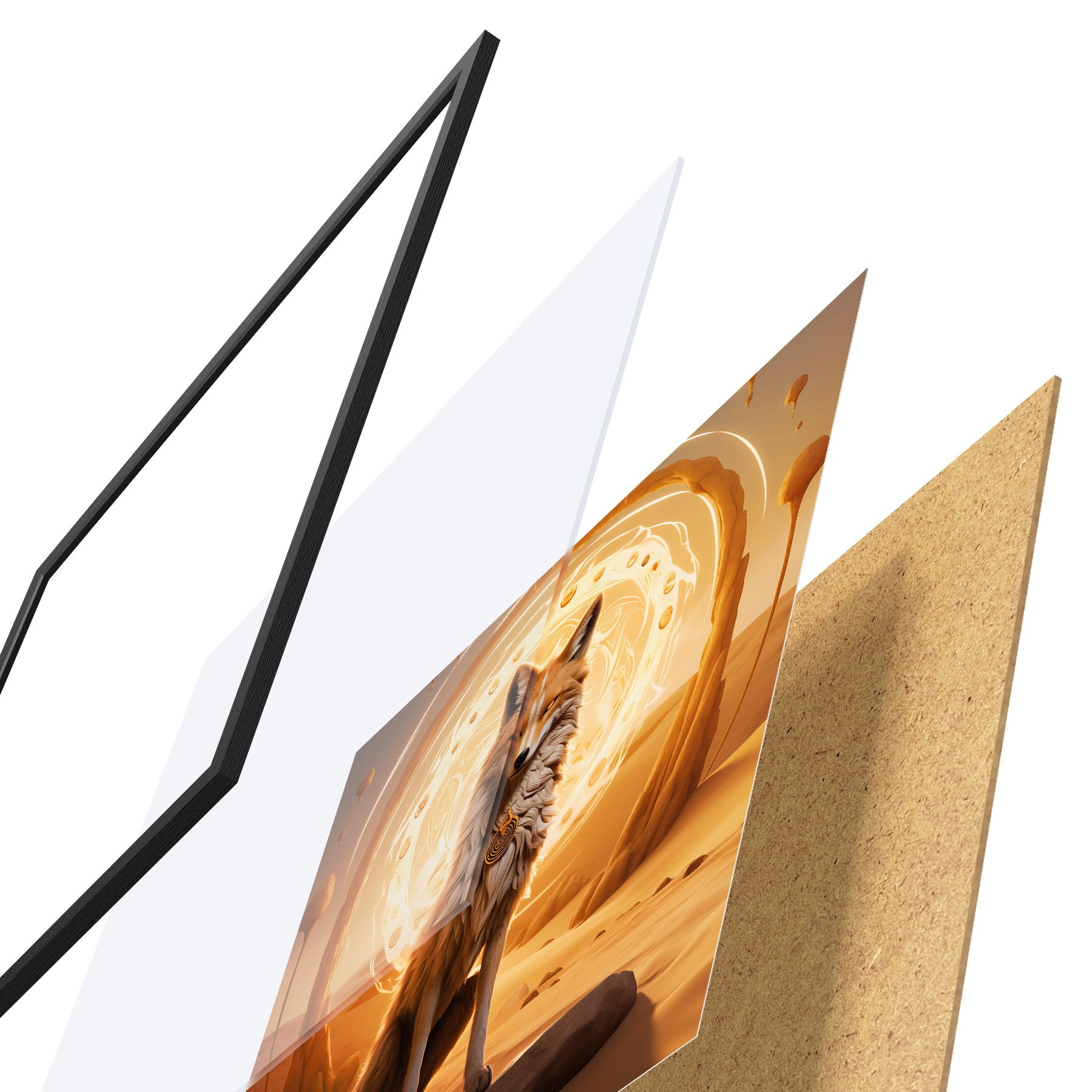 Plakát se skládá z rámu, plexiskla, tištěného obrazu a dřevotřískového podkladu. Díky úchytům na zadní straně lze plakát ihned zavěsit na zeď.