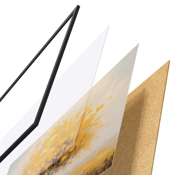 Plakát se skládá z rámu, plexiskla, tištěného obrazu a dřevotřískového podkladu. Díky úchytům na zadní straně lze plakát ihned zavěsit na zeď.