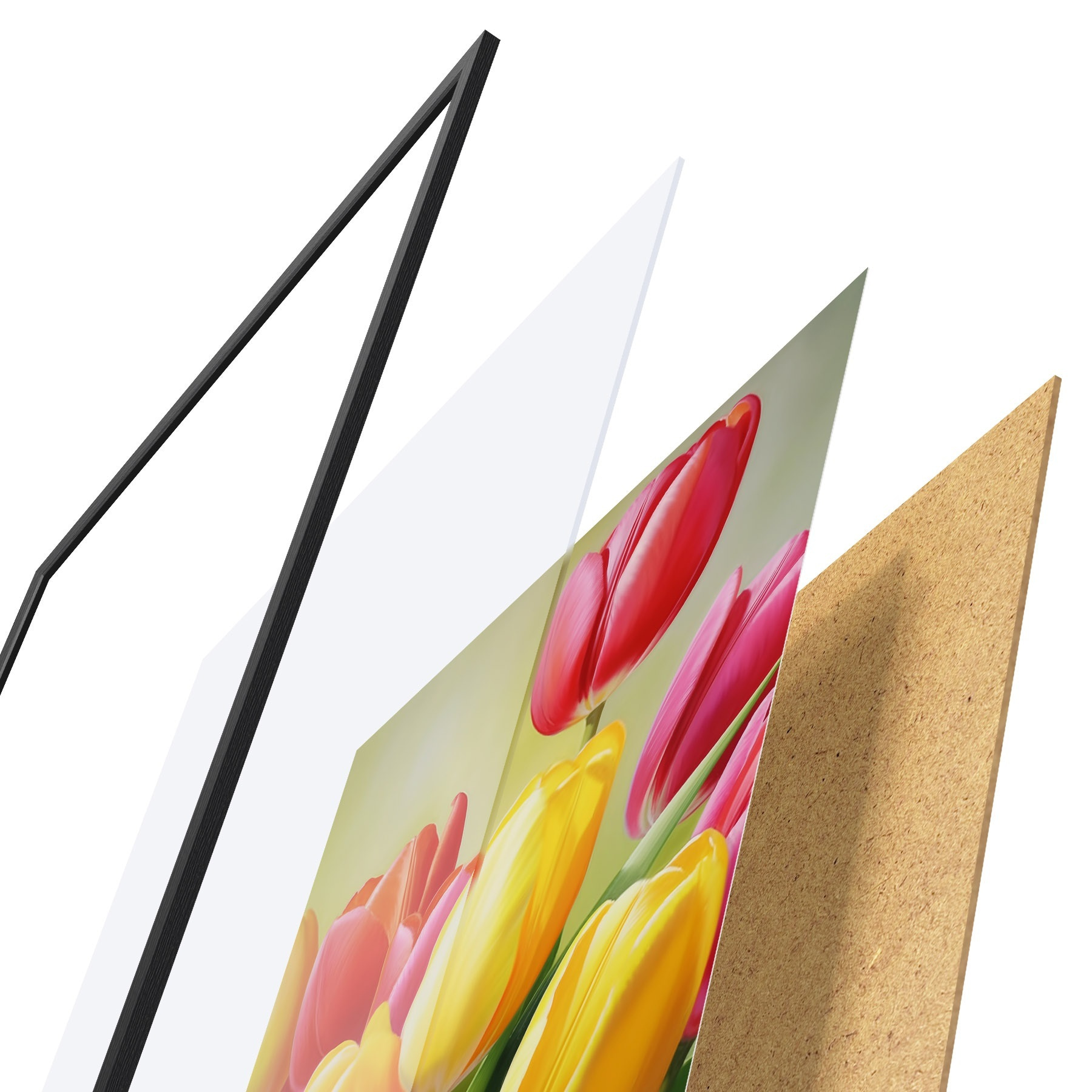Plakát se skládá z rámu, plexiskla, tištěného obrazu a dřevotřískového podkladu. Díky úchytům na zadní straně lze plakát ihned zavěsit na zeď.