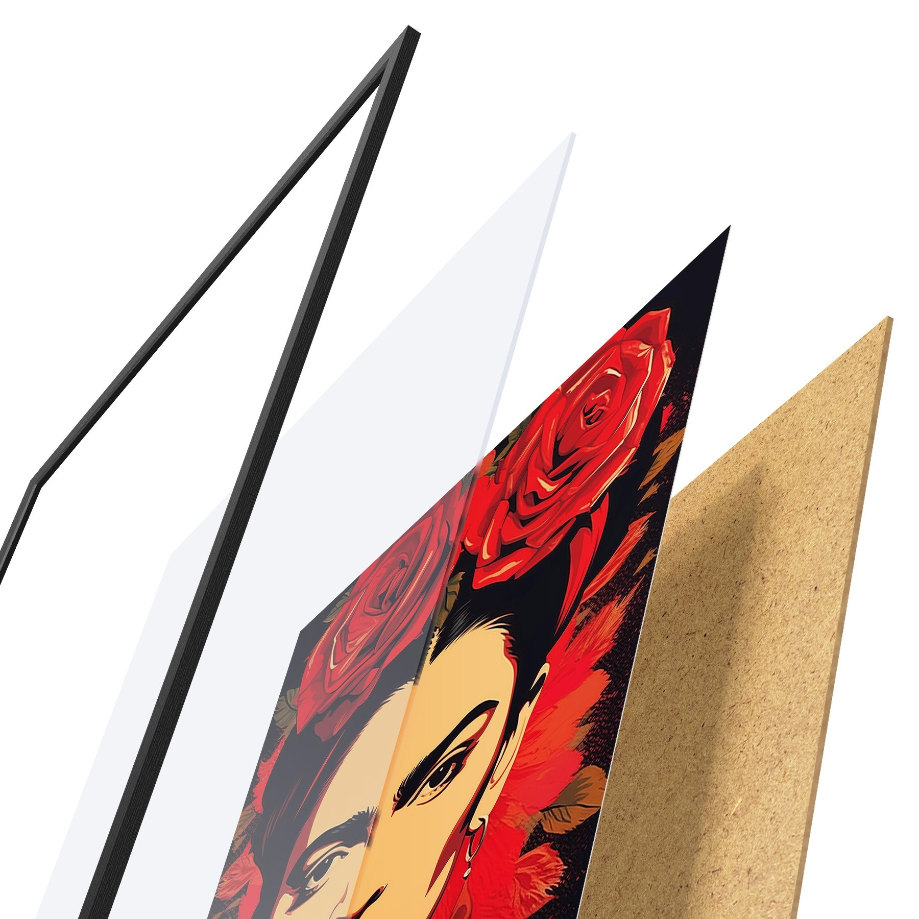 Plakát se skládá z rámu, plexiskla, tištěného obrazu a dřevotřískového podkladu. Díky úchytům na zadní straně lze plakát ihned zavěsit na zeď.
