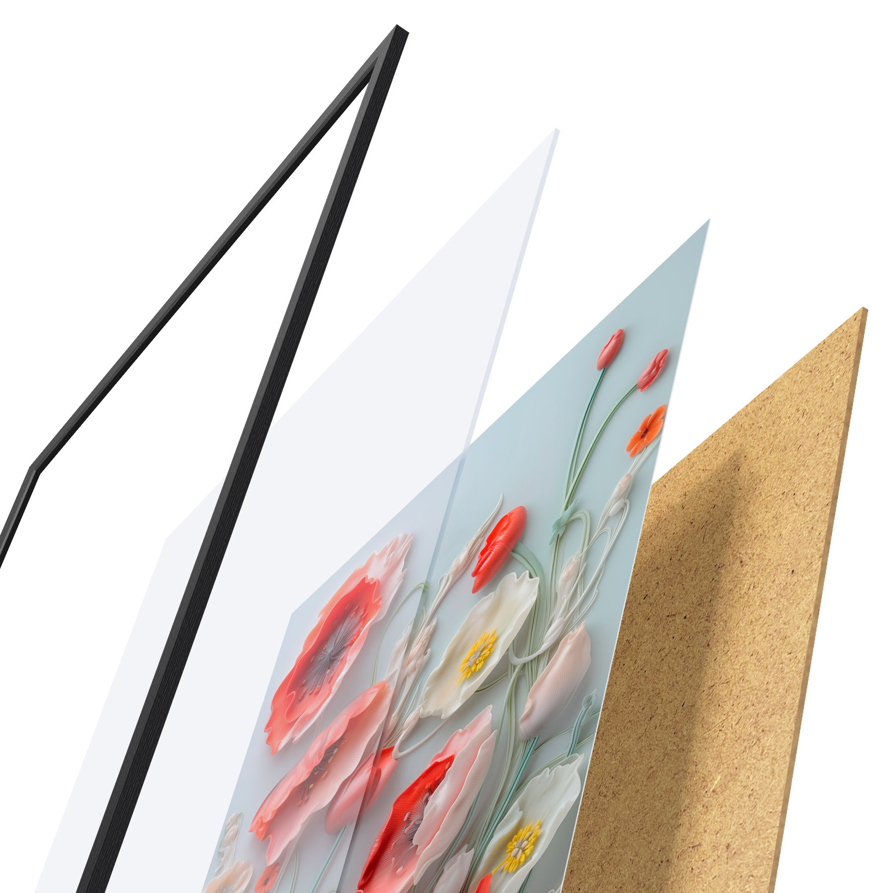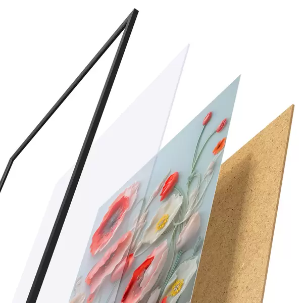 Plakát se skládá z rámu, plexiskla, tištěného obrazu a dřevotřískového podkladu. Díky úchytům na zadní straně lze plakát ihned zavěsit na zeď.