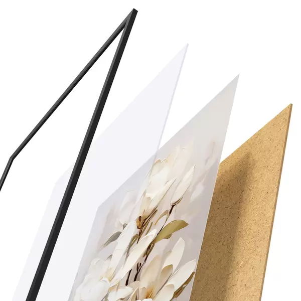 Plakát se skládá z rámu, plexiskla, tištěného obrazu a dřevotřískového podkladu. Díky úchytům na zadní straně lze plakát ihned zavěsit na zeď.