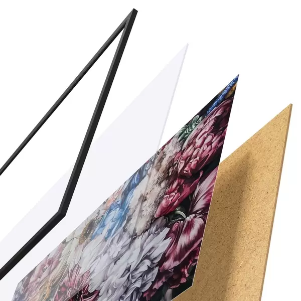 Plakát se skládá z rámu, plexiskla, tištěného obrazu a dřevotřískového podkladu. Díky úchytům na zadní straně lze plakát ihned zavěsit na zeď.