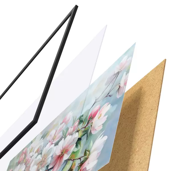 Plakát se skládá z rámu, plexiskla, tištěného obrazu a dřevotřískového podkladu. Díky úchytům na zadní straně lze plakát ihned zavěsit na zeď.
