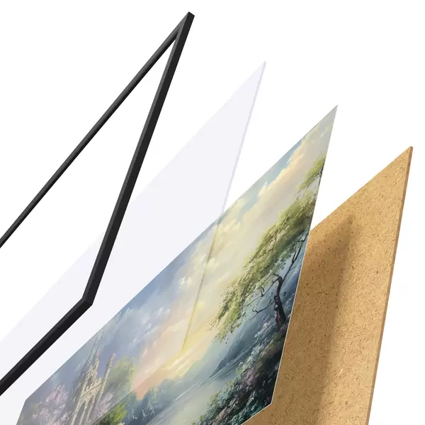Plakát se skládá z rámu, plexiskla, tištěného obrazu a dřevotřískového podkladu. Díky úchytům na zadní straně lze plakát ihned zavěsit na zeď.