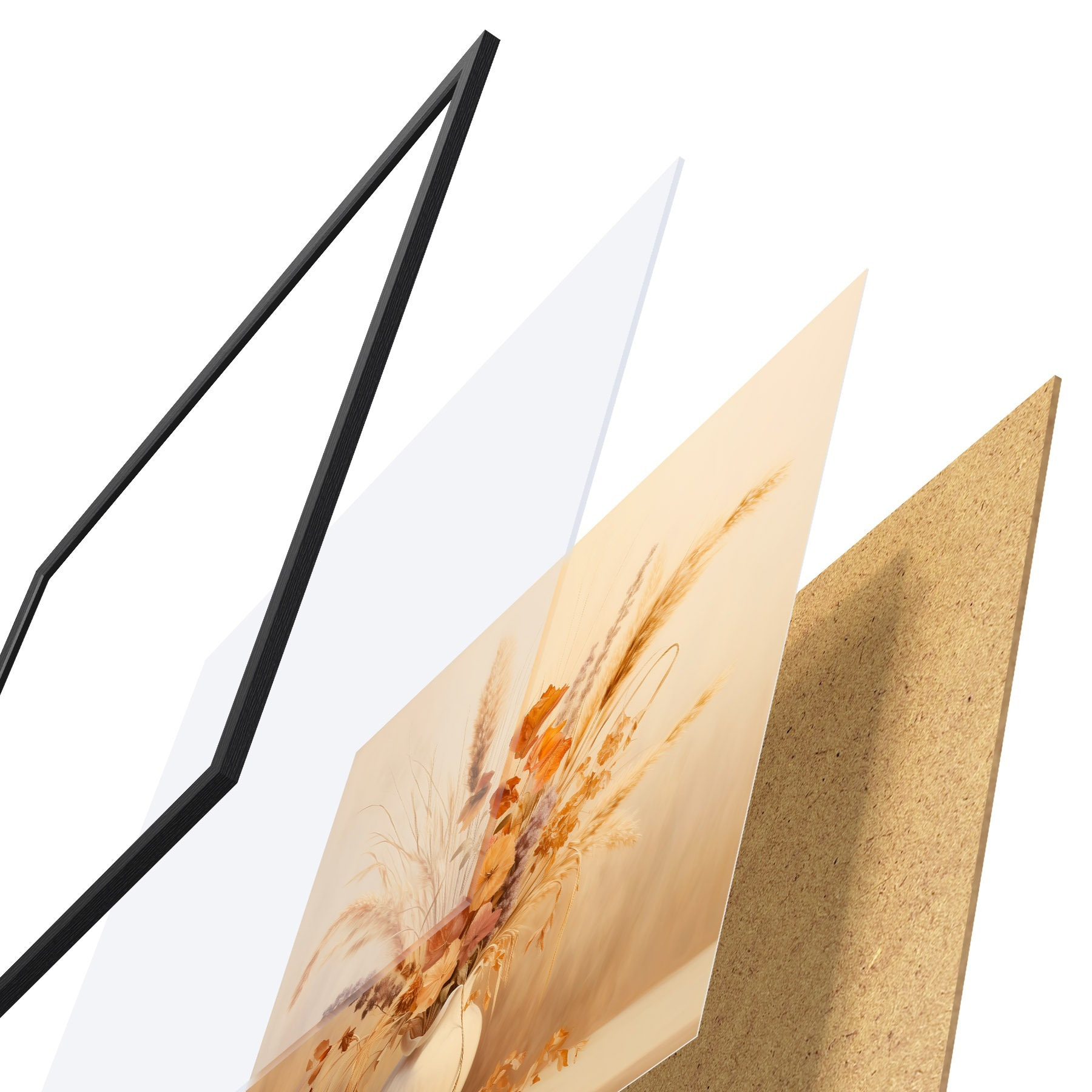 Plakát se skládá z rámu, plexiskla, tištěného obrazu a dřevotřískového podkladu. Díky úchytům na zadní straně lze plakát ihned zavěsit na zeď.
