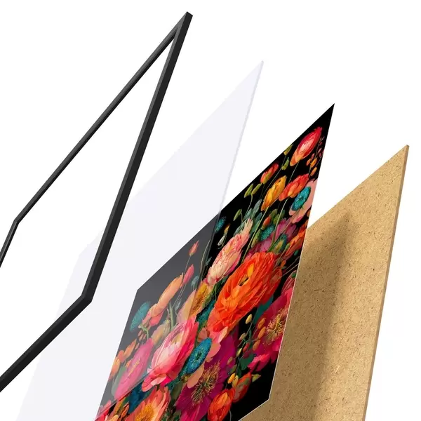 Plakát se skládá z rámu, plexiskla, tištěného obrazu a dřevotřískového podkladu. Díky úchytům na zadní straně lze plakát ihned zavěsit na zeď.