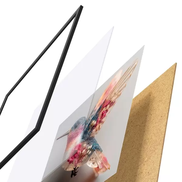 Plakát se skládá z rámu, plexiskla, tištěného obrazu a dřevotřískového podkladu. Díky úchytům na zadní straně lze plakát ihned zavěsit na zeď.