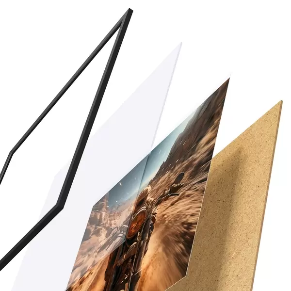 Plakát se skládá z rámu, plexiskla, tištěného obrazu a dřevotřískového podkladu. Díky úchytům na zadní straně lze plakát ihned zavěsit na zeď.
