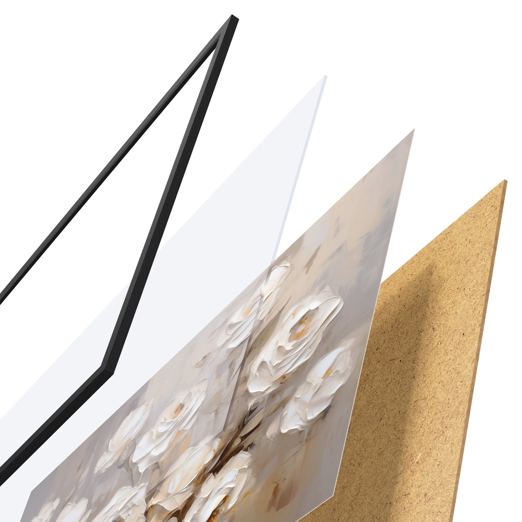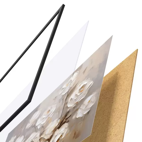 Plakát se skládá z rámu, plexiskla, tištěného obrazu a dřevotřískového podkladu. Díky úchytům na zadní straně lze plakát ihned zavěsit na zeď.