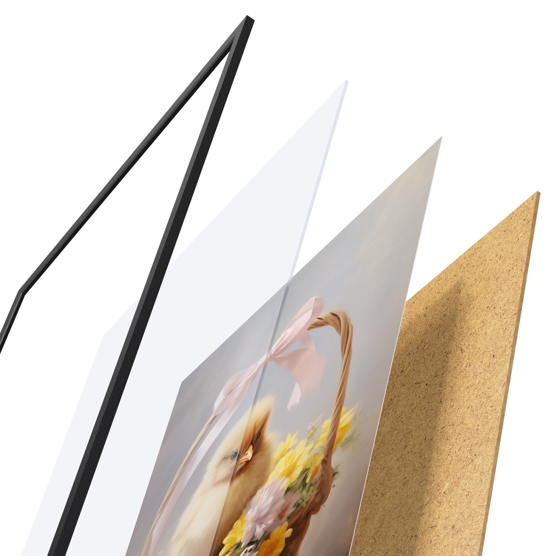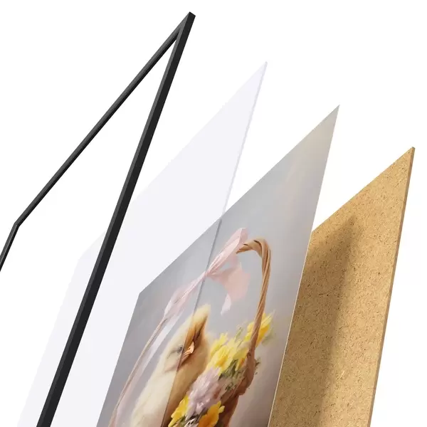 Plakát se skládá z rámu, plexiskla, tištěného obrazu a dřevotřískového podkladu. Díky úchytům na zadní straně lze plakát ihned zavěsit na zeď.