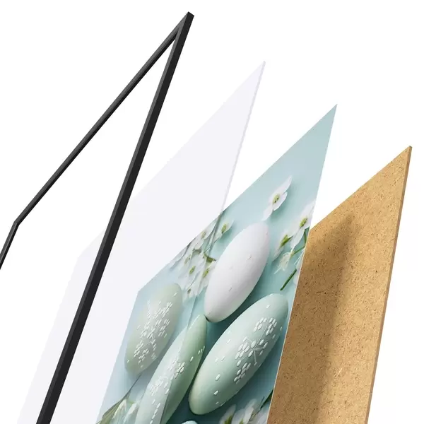 Plakát se skládá z rámu, plexiskla, tištěného obrazu a dřevotřískového podkladu. Díky úchytům na zadní straně lze plakát ihned zavěsit na zeď.
