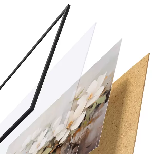 Plakát se skládá z rámu, plexiskla, tištěného obrazu a dřevotřískového podkladu. Díky úchytům na zadní straně lze plakát ihned zavěsit na zeď.