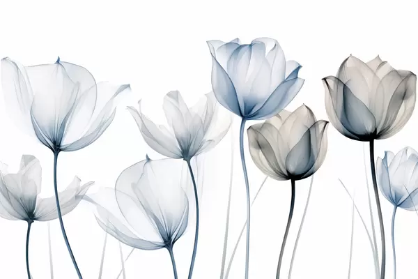 Poster Průsvitné modré a bílé tulipány s dlouhými stonky na hladkém bílém pozadí Č. f44409