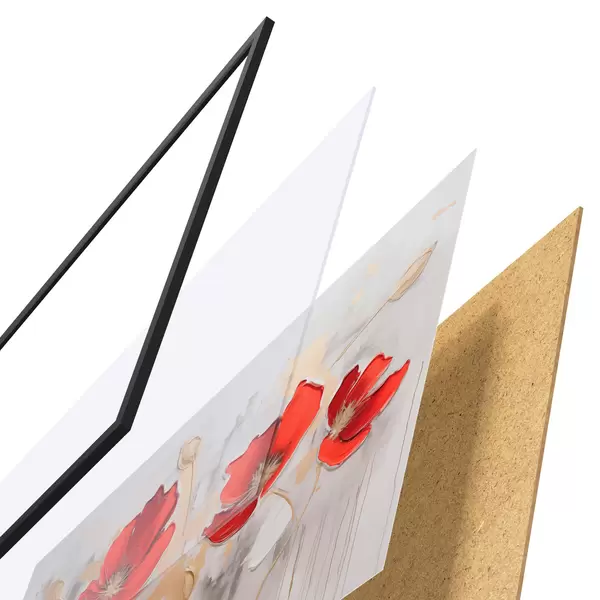 Plakát se skládá z rámu, plexiskla, tištěného obrazu a dřevotřískového podkladu. Díky úchytům na zadní straně lze plakát ihned zavěsit na zeď.