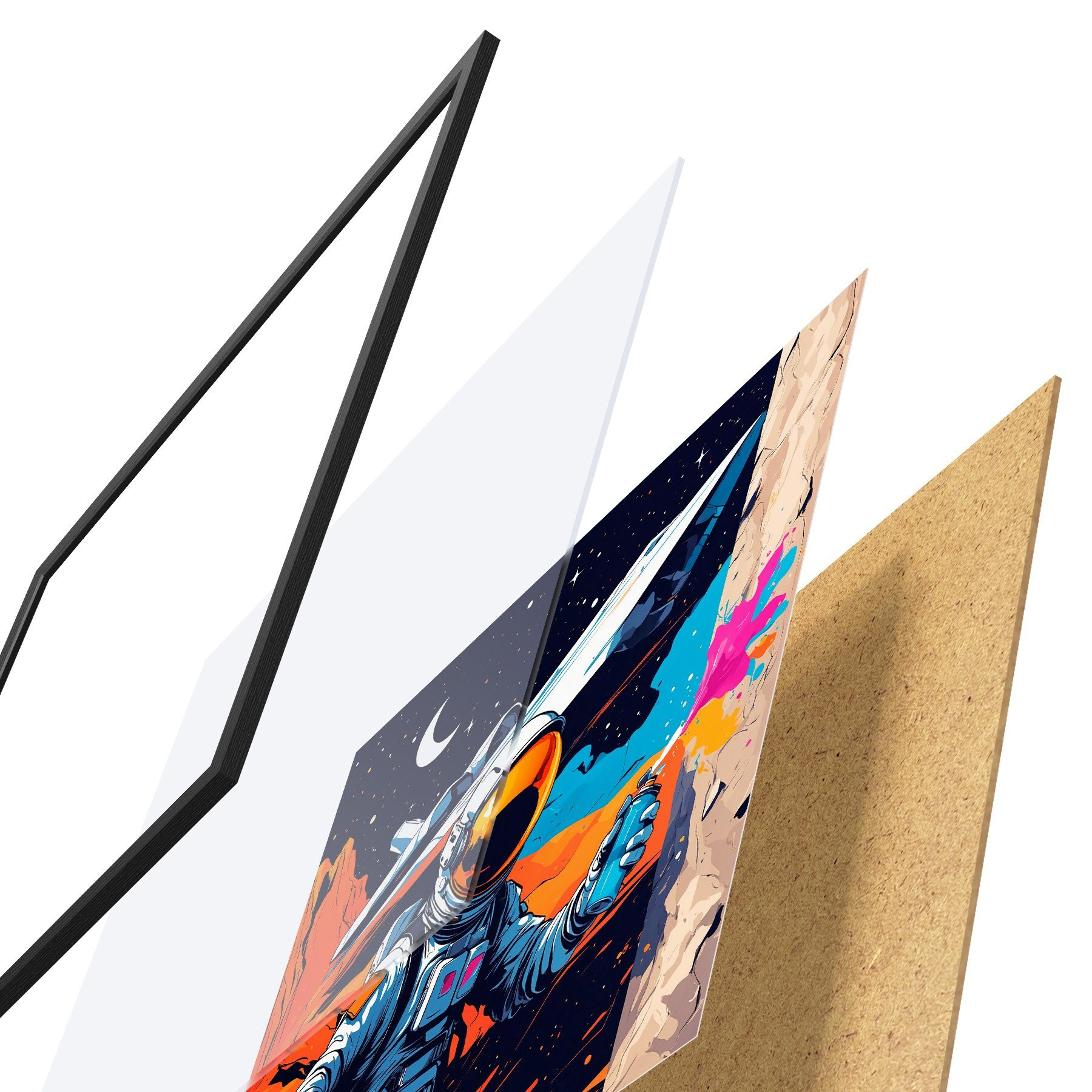 Plakát se skládá z rámu, plexiskla, tištěného obrazu a dřevotřískového podkladu. Díky úchytům na zadní straně lze plakát ihned zavěsit na zeď.