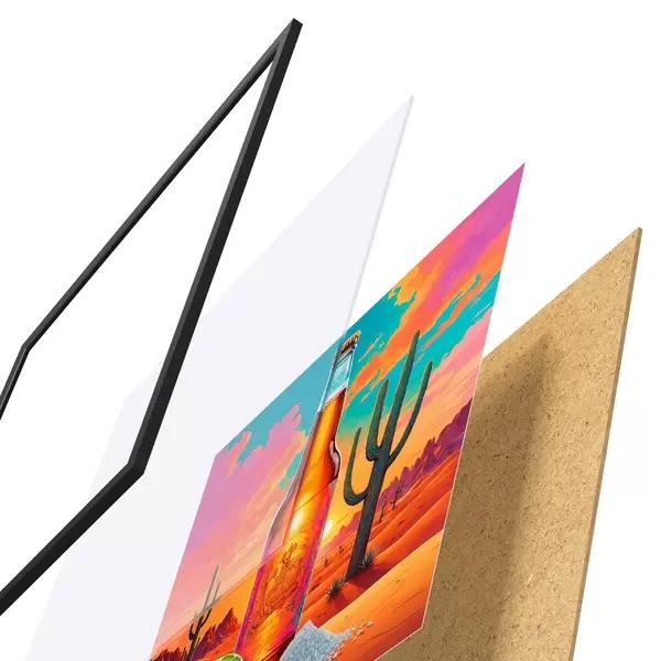 Plakát se skládá z rámu, plexiskla, tištěného obrazu a dřevotřískového podkladu. Díky úchytům na zadní straně lze plakát ihned zavěsit na zeď.