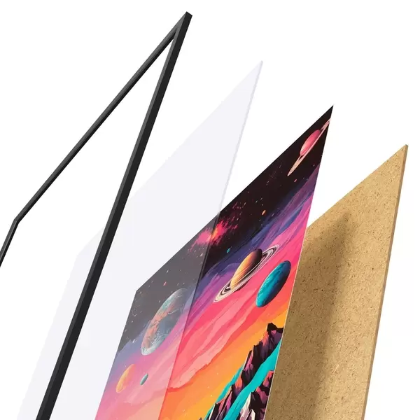 Plakát se skládá z rámu, plexiskla, tištěného obrazu a dřevotřískového podkladu. Díky úchytům na zadní straně lze plakát ihned zavěsit na zeď.