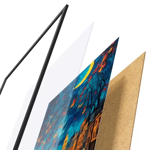 Plakát se skládá z rámu, plexiskla, tištěného obrazu a dřevotřískového podkladu. Díky úchytům na zadní straně lze plakát ihned zavěsit na zeď.