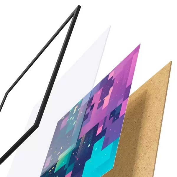 Plakát se skládá z rámu, plexiskla, tištěného obrazu a dřevotřískového podkladu. Díky úchytům na zadní straně lze plakát ihned zavěsit na zeď.