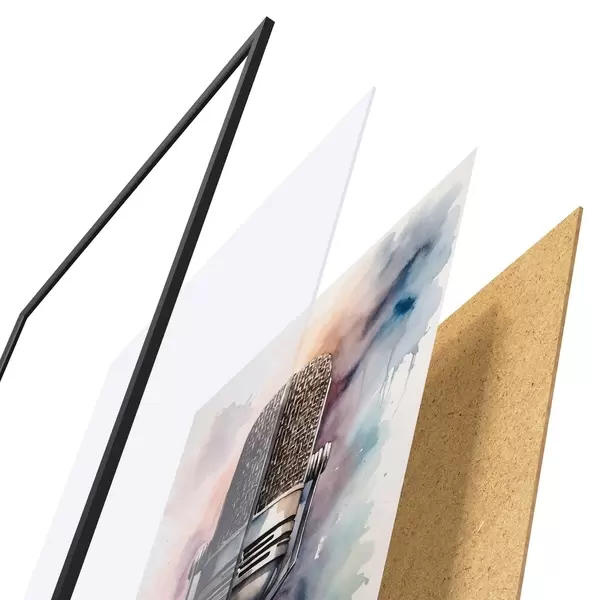 Plakát se skládá z rámu, plexiskla, tištěného obrazu a dřevotřískového podkladu. Díky úchytům na zadní straně lze plakát ihned zavěsit na zeď.