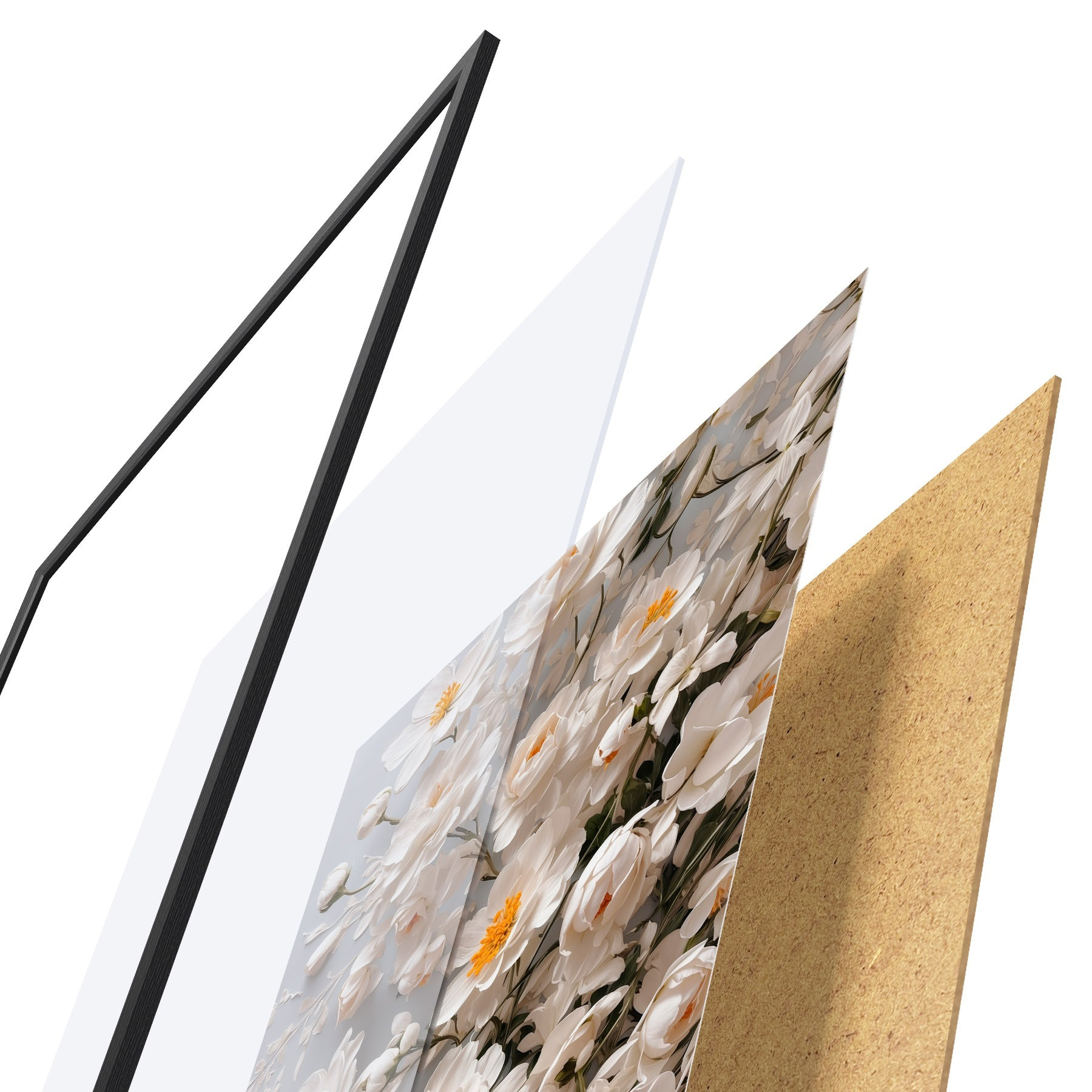 Plakát se skládá z rámu, plexiskla, tištěného obrazu a dřevotřískového podkladu. Díky úchytům na zadní straně lze plakát ihned zavěsit na zeď.