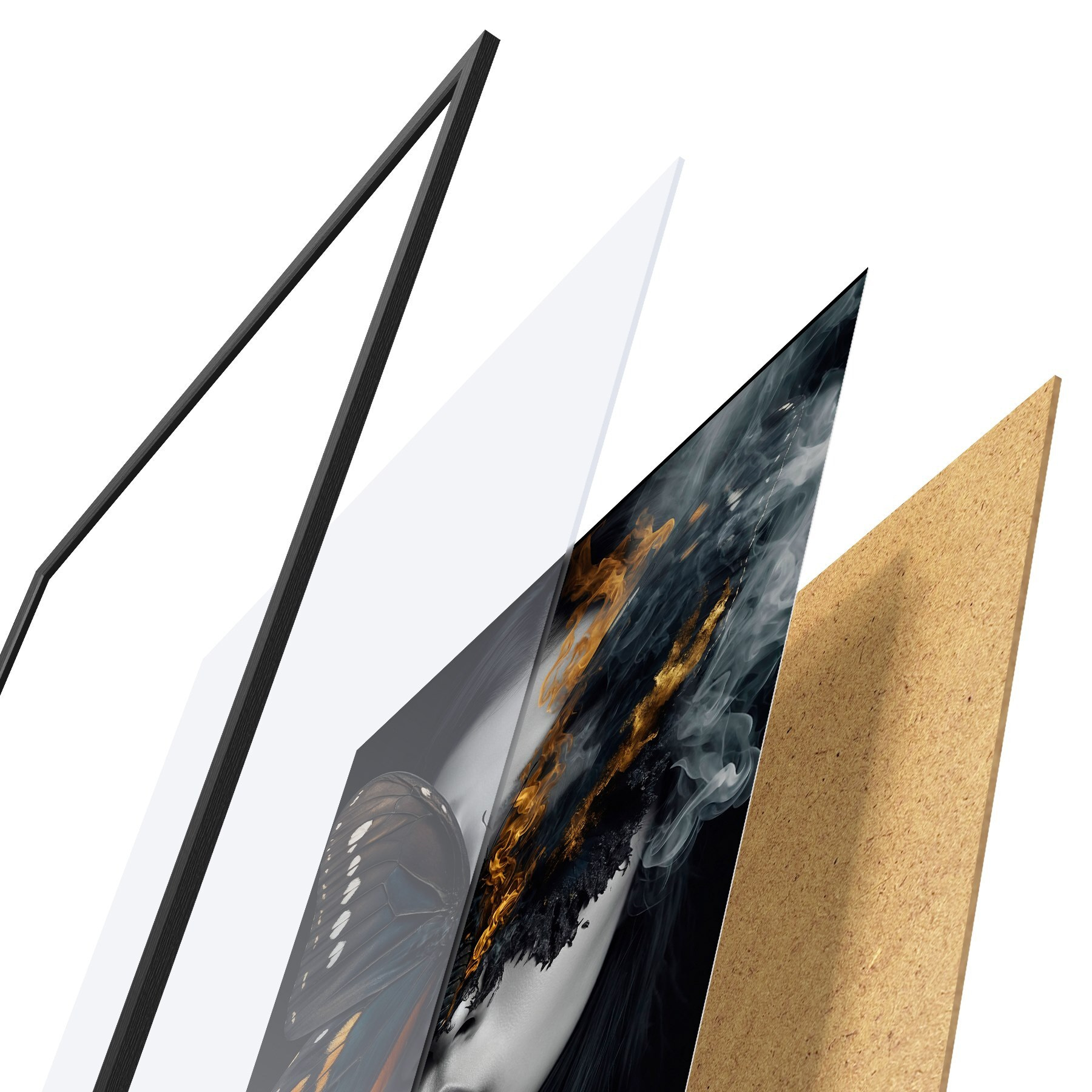 Plakát se skládá z rámu, plexiskla, tištěného obrazu a dřevotřískového podkladu. Díky úchytům na zadní straně lze plakát ihned zavěsit na zeď.