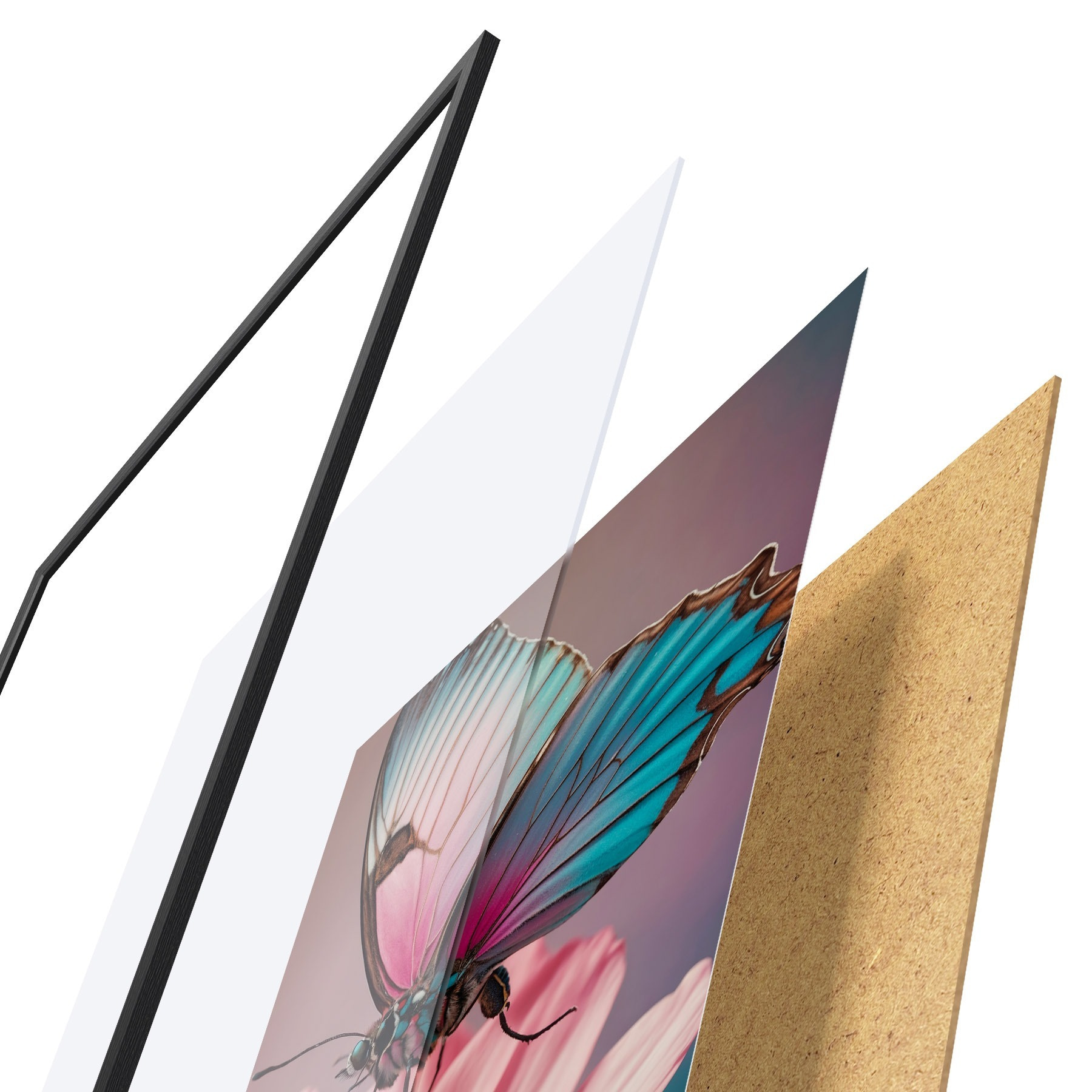 Plakát se skládá z rámu, plexiskla, tištěného obrazu a dřevotřískového podkladu. Díky úchytům na zadní straně lze plakát ihned zavěsit na zeď.