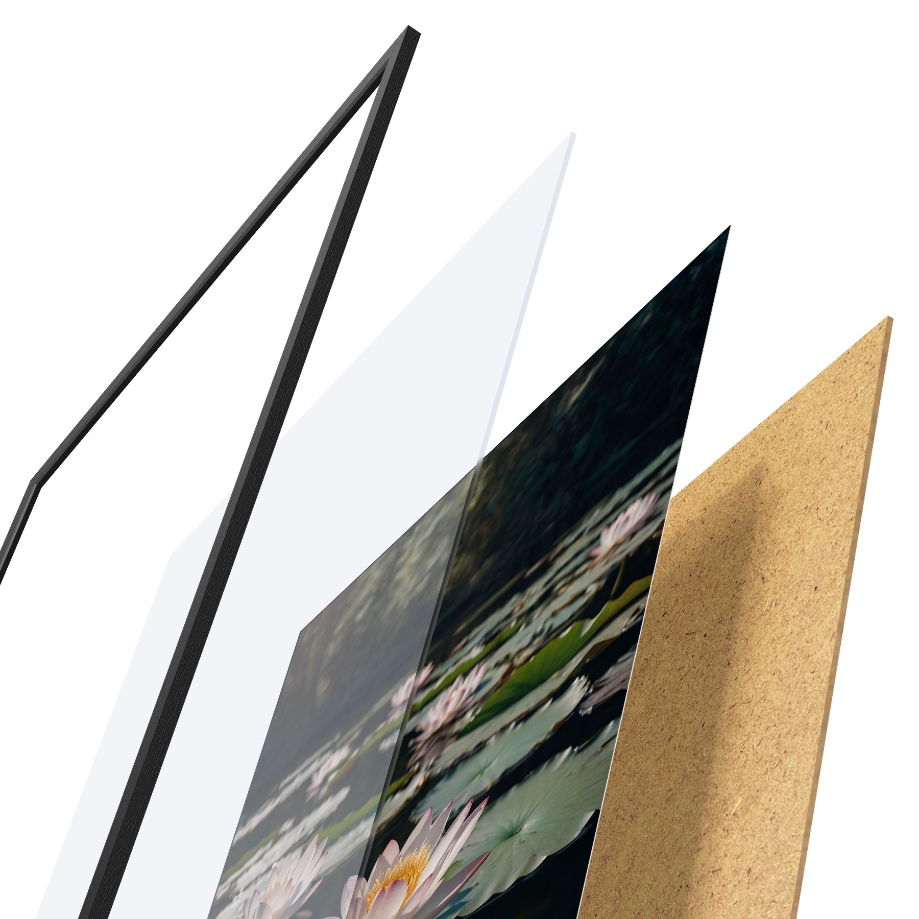 Plakát se skládá z rámu, plexiskla, tištěného obrazu a dřevotřískového podkladu. Díky úchytům na zadní straně lze plakát ihned zavěsit na zeď.