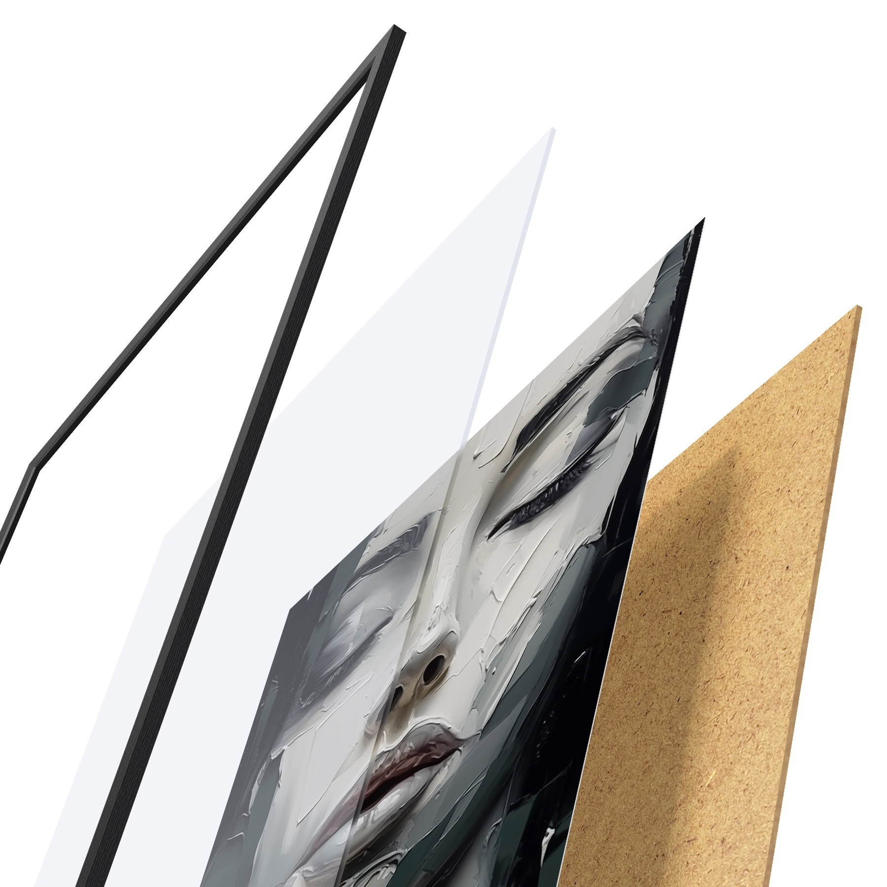 Plakát se skládá z rámu, plexiskla, tištěného obrazu a dřevotřískového podkladu. Díky úchytům na zadní straně lze plakát ihned zavěsit na zeď.